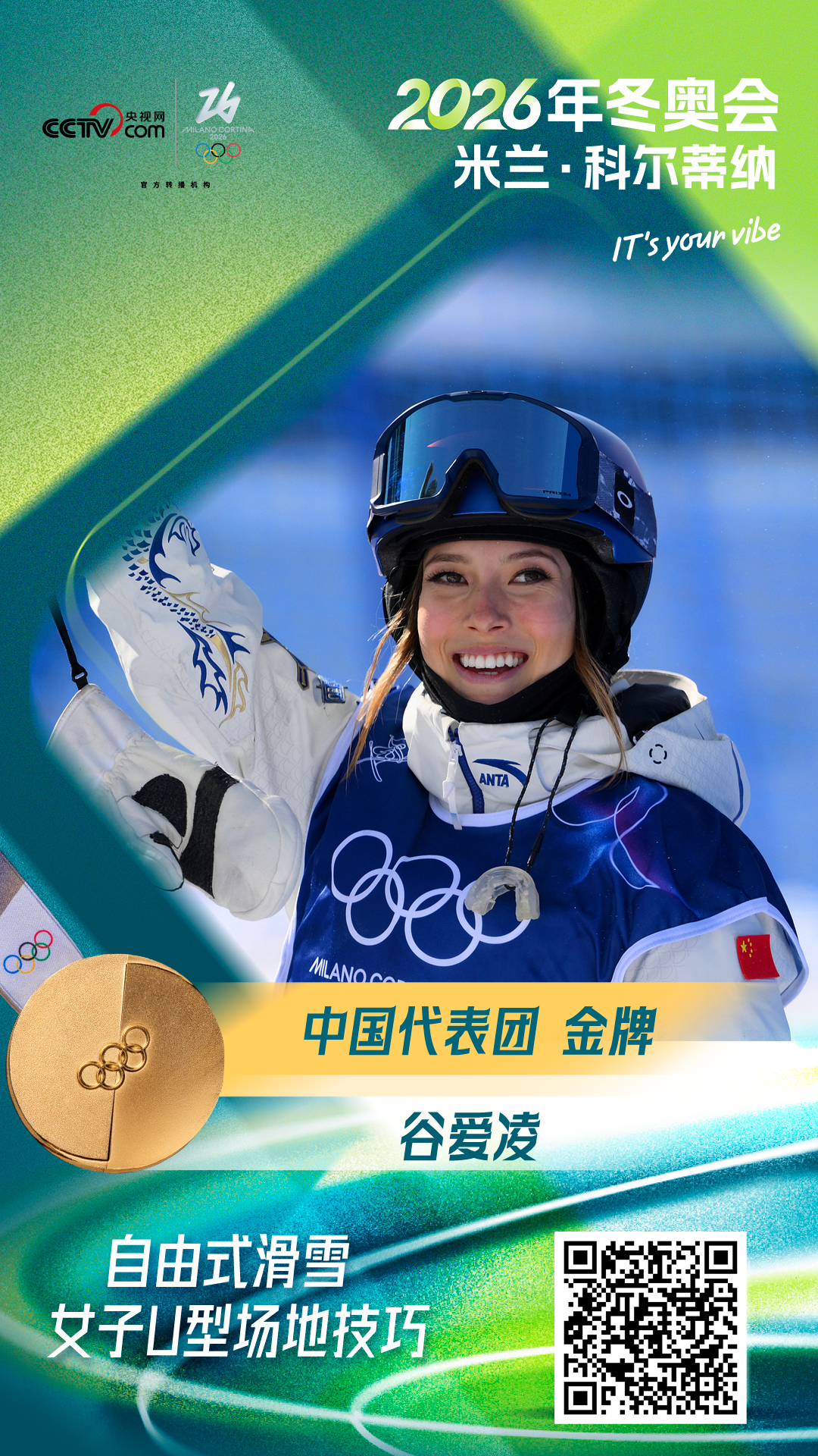 央视网消息:北京时间2月22日,2026年冬奥会自由式滑雪女子U型场地技巧决赛,中国选手谷爱凌凭借第三跳的94.75分,获得冠军。这也是中国代表团在本届冬奥会上的第5金!另一名中国选手李方慧在第三跳中发挥出色,获得93.00分,最终获得亚军,中国队包揽冠亚军。[图]谷爱凌冬奥会U型场地技巧卫冕 中国队包揽冠亚军...